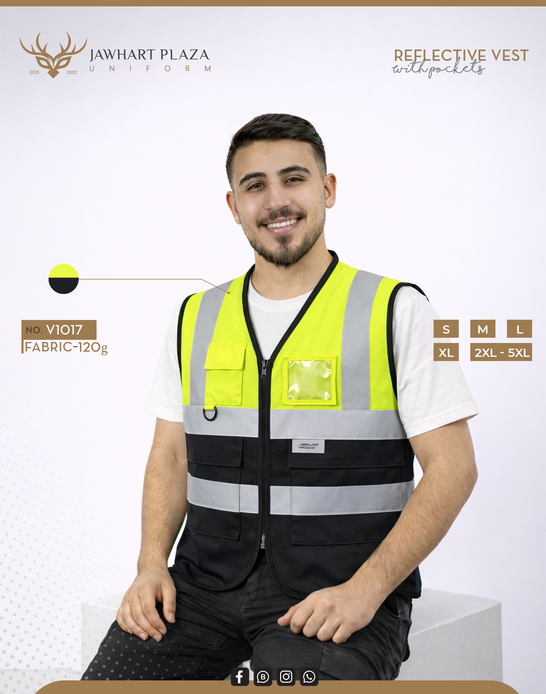 سترة عمل عاكسة مصنوعة من فابريك عالي الجودة بوزن 120 جرام، مع شرائط عاكسة وجيوب عملية